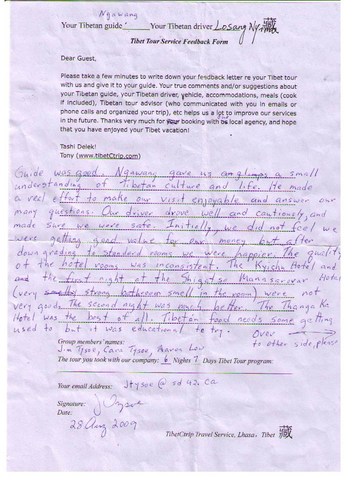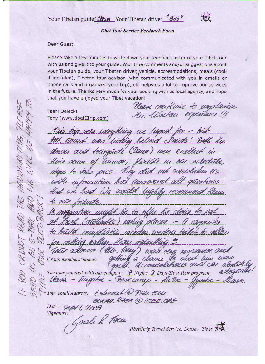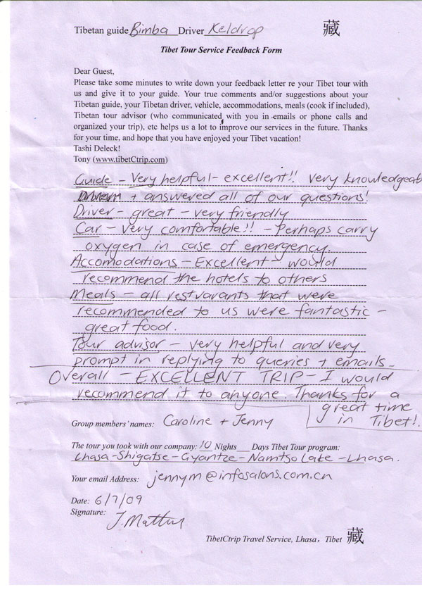 These feedback letters were provided by our guests who traveled with us before April 2012. Please get more Tibet travel reference from the Tibet travel reviews 2013 , 2014 , 2015, Latest 2016, 2017 as on Trip Advisor, 2018 as on Trip Advisor
