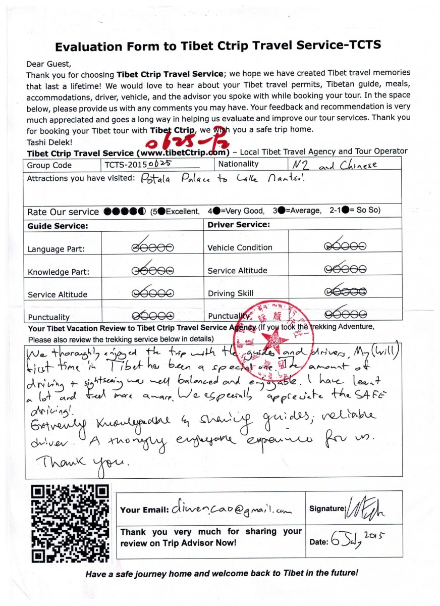 Our customers are from around the world. They are individual travelers, couples, families, friend groups, etc. True feelings and experiences of their once in a life time Tibet tour were recorded, some of which are valuable suggestions that help us improve the service in the future. We sincerely appreciate that if you could get to know more about our staff and our work via these reviews and word of mouth and choose Tibet Ctrip Travel Service as your local Tibet tour operator.Please get more Tibet travel reference from the latest Tibet travel reviews 2013 , 2014 , 2015 (Tibet travel reviews before 2012), welcome to share a few latest Tibet travel videos. If you want to have the direct Tibet tour and trekking video reference, please email us for more details.