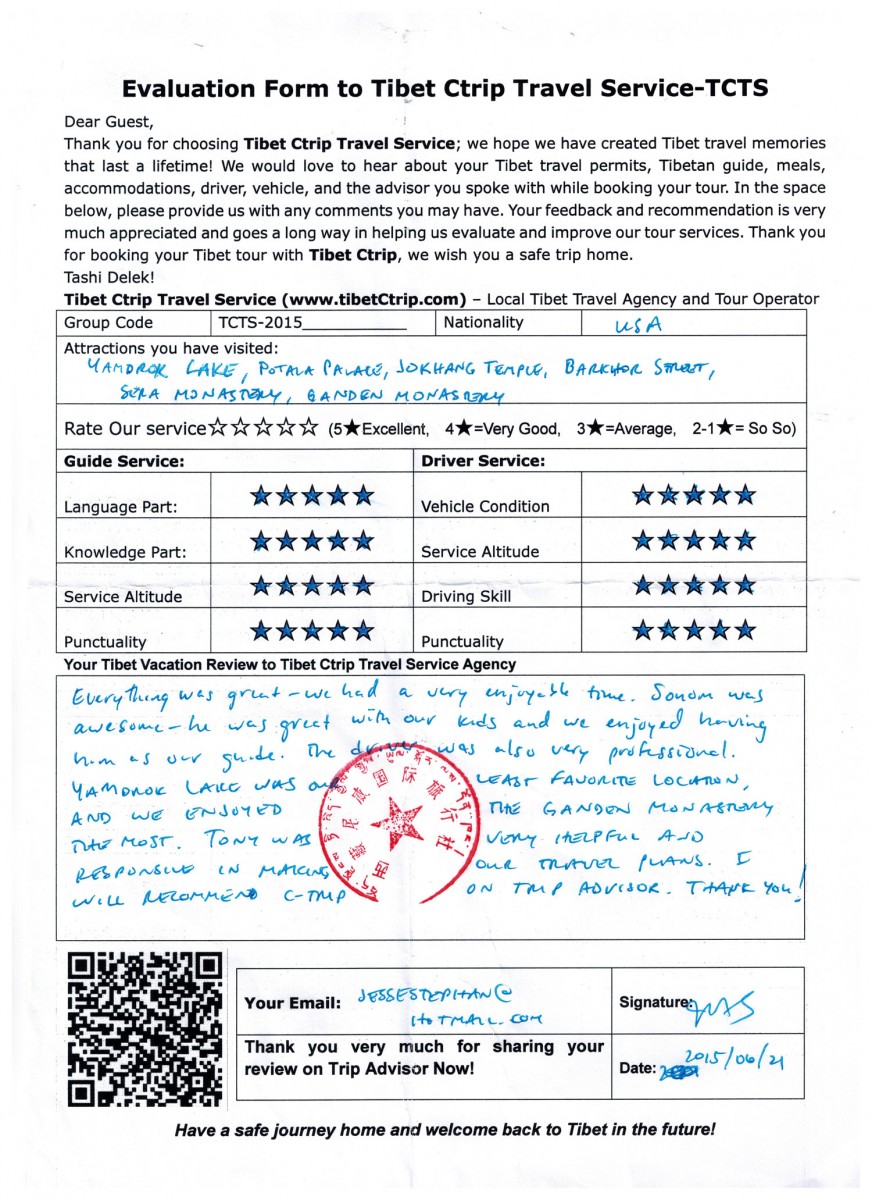 Our customers are from around the world. They are individual travelers, couples, families, friend groups, etc. True feelings and experiences of their once in a life time Tibet tour were recorded, some of which are valuable suggestions that help us improve the service in the future. We sincerely appreciate that if you could get to know more about our staff and our work via these reviews and word of mouth and choose Tibet Ctrip Travel Service as your local Tibet tour operator.Please get more Tibet travel reference from the latest Tibet travel reviews 2013 , 2014 , 2015 (Tibet travel reviews before 2012), welcome to share a few latest Tibet travel videos. If you want to have the direct Tibet tour and trekking video reference, please email us for more details.