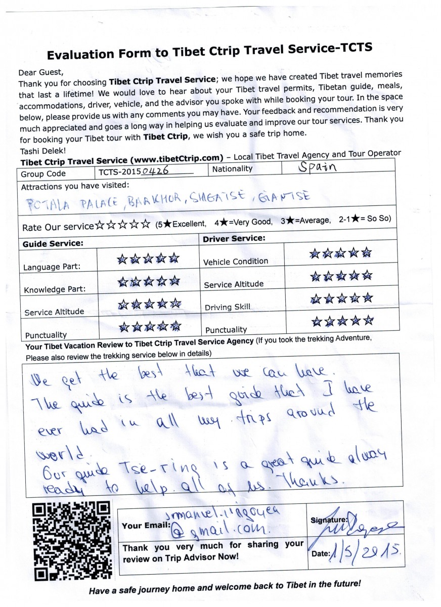 Our customers are from around the world. They are individual travelers, couples, families, friend groups, etc. True feelings and experiences of their once in a life time Tibet tour were recorded, some of which are valuable suggestions that help us improve the service in the future. We sincerely appreciate that if you could get to know more about our staff and our work via these reviews and word of mouth and choose Tibet Ctrip Travel Service as your local Tibet tour operator.Please get more Tibet travel reference from the latest Tibet travel reviews 2013 , 2014 , 2015 (Tibet travel reviews before 2012), welcome to share a few latest Tibet travel videos. If you want to have the direct Tibet tour and trekking video reference, please email us for more details.