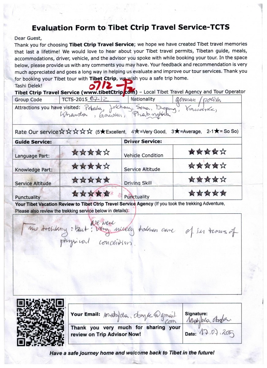 Travelers Name: ERNST PETER AMAT KREFT and MATYLDA FRANCISZKA OBRYK (read the Tibet Ctrip travel agency review 2015)