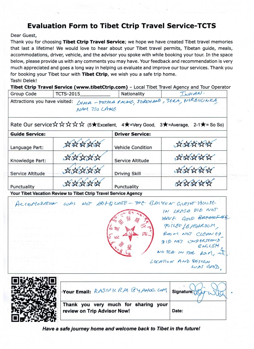 Travelers Name: Praveena & Rajiv Rai (read the Tibet Ctrip travel agency review 2015)