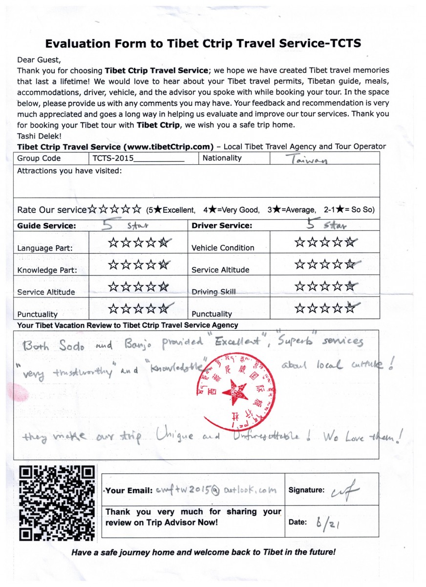 Travelers Name: Miss LiJiaqian and Mr. Feng Chiwei from Taiwan (read the Tibet Ctrip travel agency review 2015)