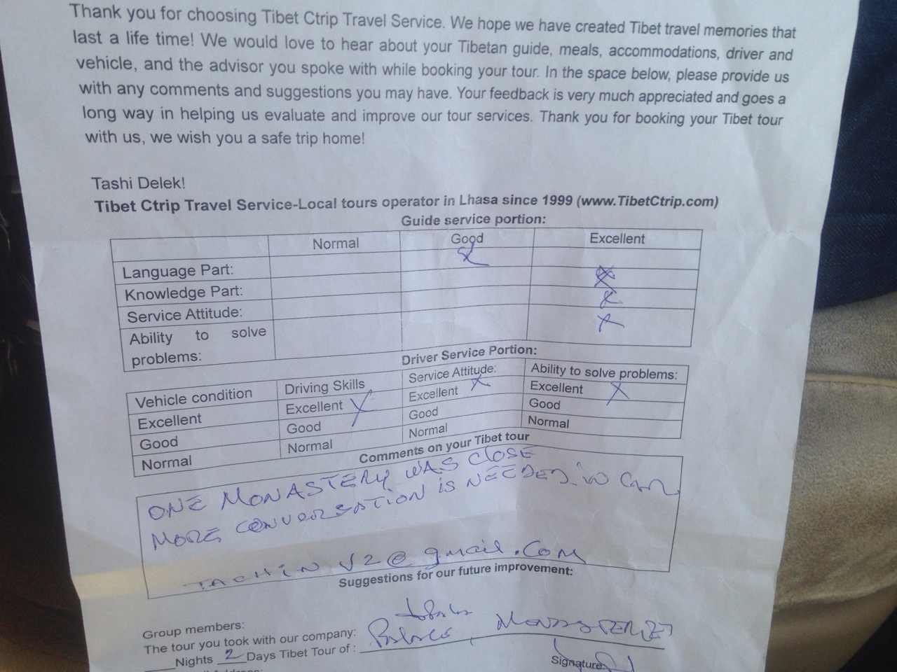 April 3rd, transfer to the airport for morning flight back to Chengdu CA4402, 10:55am-12:50. Check out the handwritten feedback letter form for Tibet travel agency review!