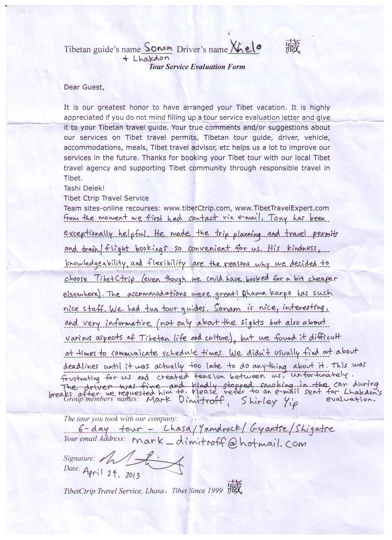 Budget Tibet Cultural tour review, April 19 to 25, 2013 by distinguished guests Mark from Canada and Shirley from Australia (mark_dimitroff (at) hotmail (dot) com