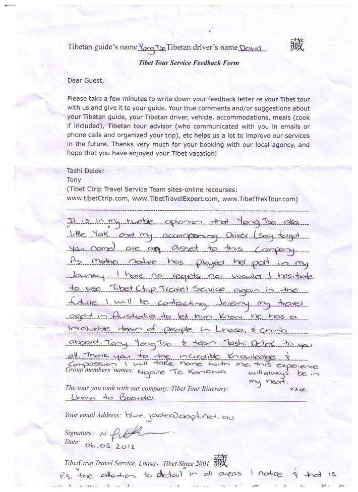 Tour Code: 20120426-p1, Check out the Tibet tour review handwritten form: http://www.tibetctrip.com/assets/images/feedback2012/0426-t1.jpg