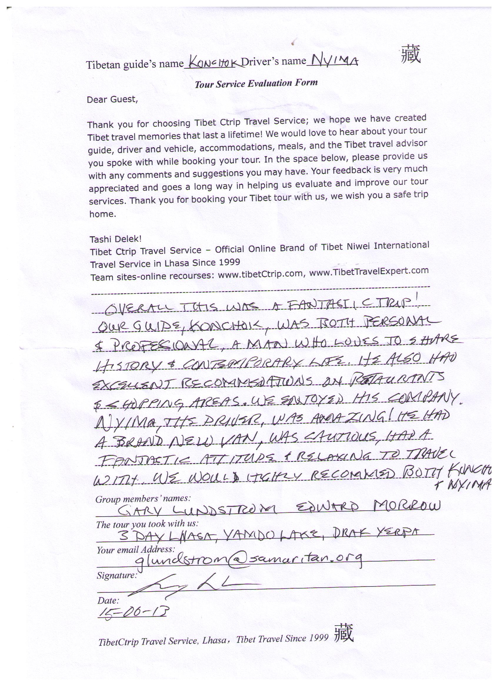 Distinguished guest Mr. GARY WALFRED LUNDSTROM and Mr. EDWARD MORROW from USA traveled in Tibet with Tibet Ctrip Travel Service. Read their handwritten Tibet travel recommendation letter!