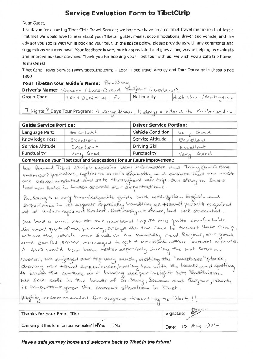 Travelers' Name: Bee & Say Khor, (see handwriten Tibet Everest Base Camp Landscape tour 2014 review)