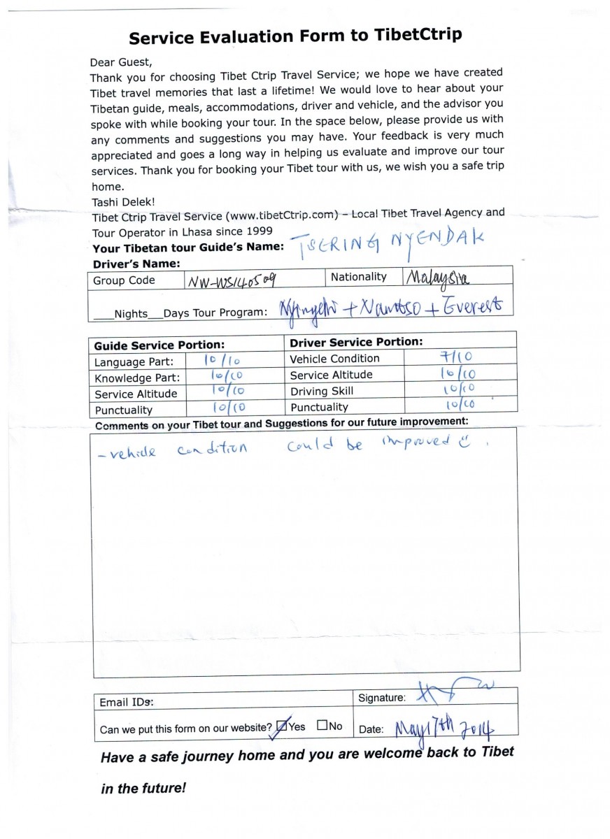 Travelers' Name: YAP HUEY SIAN, YAP GIAN FENG, OOI AH LAN, NG SEN POH (see handwriten Tibet highlight travel review 2014)