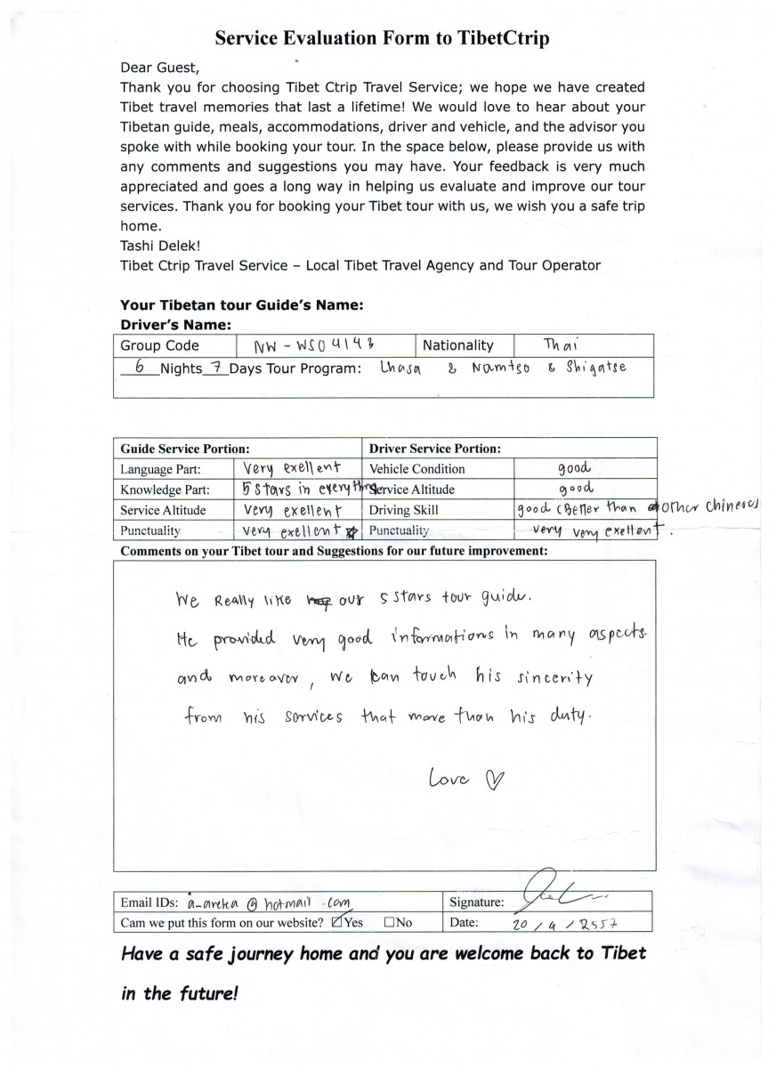 Name: Miss PRANITI DANPORNPRASERT, Miss RUETHAITIP PHUANGKASEM, Miss PRAW YINGTAVEESAK (see handwriten Tibet tour review)