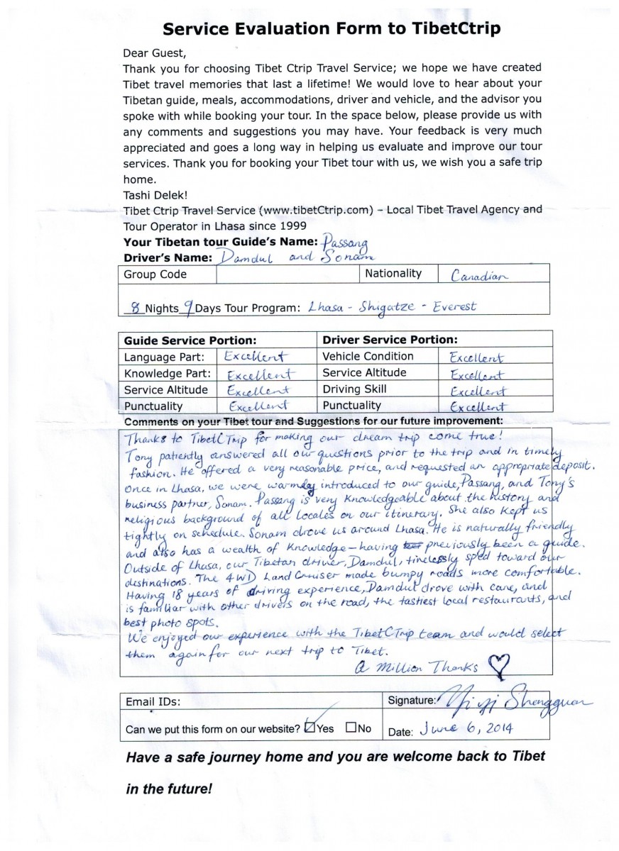 Travelers' Name: Yiyi Shangguan and Panglingling (see handwriten Tibet Namtso and Everest Landscape tour 2014 review)
